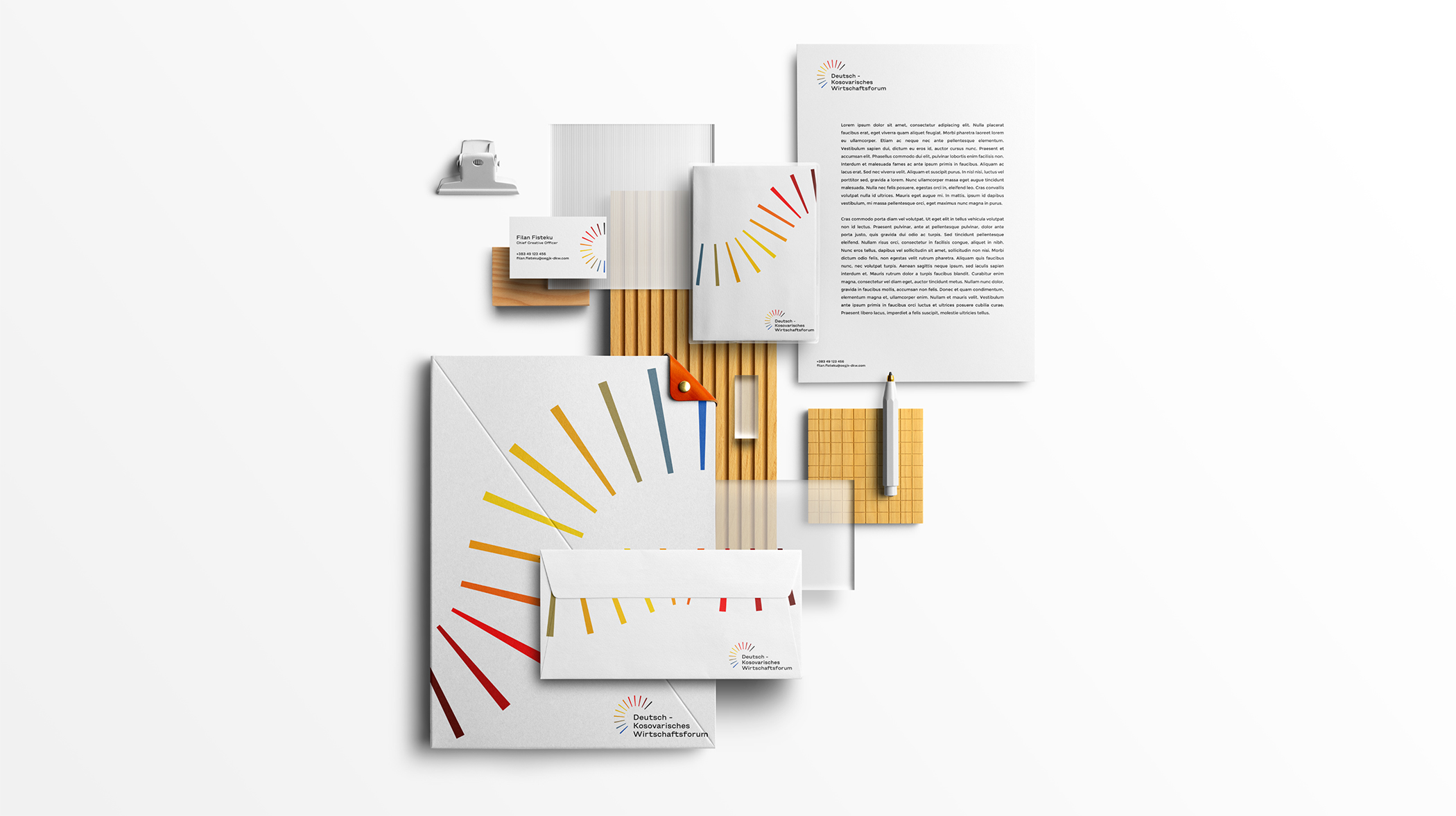 This visual became uniform to events, casual wear, totes, and office appliances that popularized and further broadened the presence of this cross-country collaboration after skillful curation of the digital brand identity of the German-Kosovar Economic Chamber.